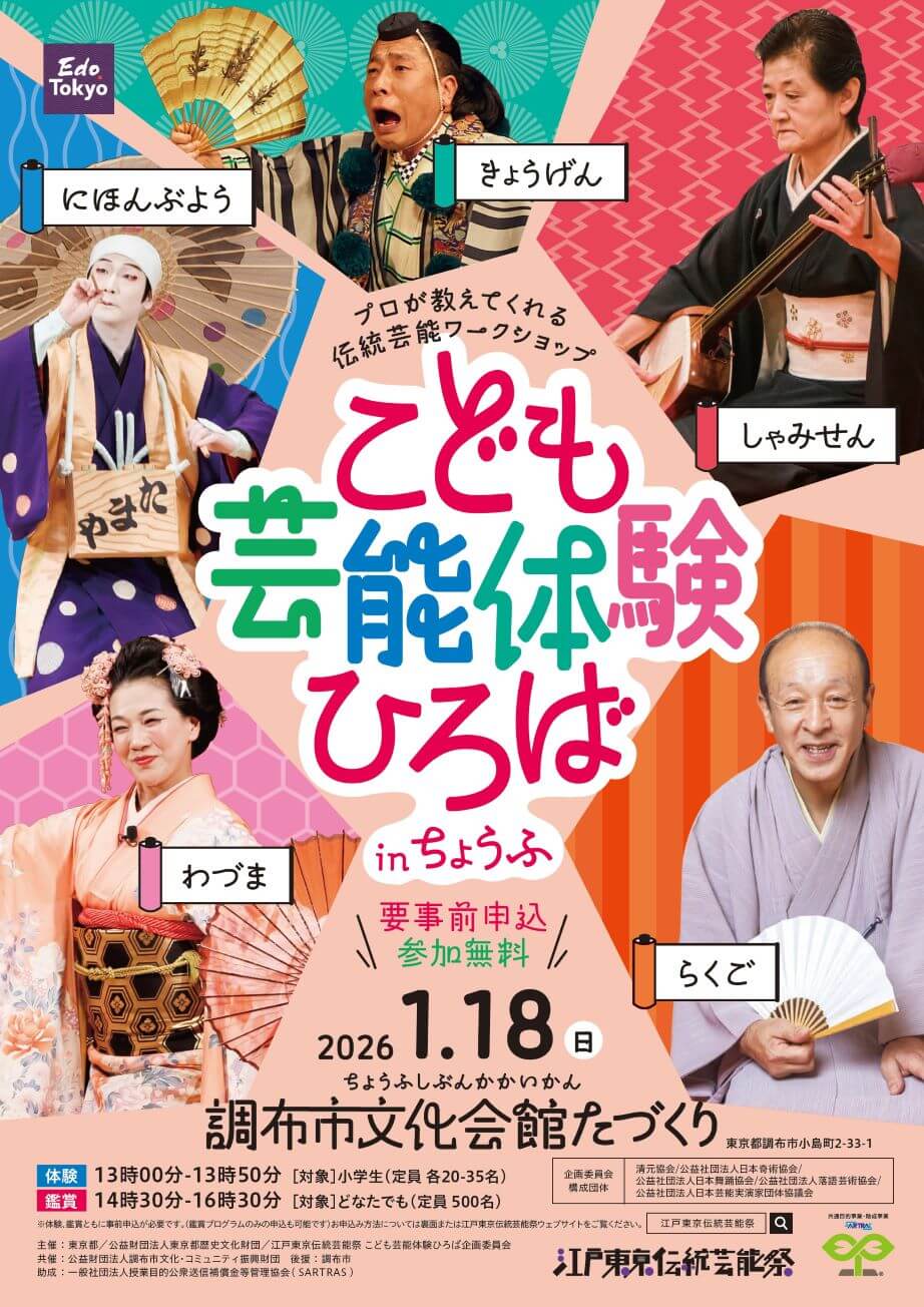 落語、和妻、狂言、三味線、日本舞踊の中から1つ選んで体験できる伝統芸能ワークショップと、伝統芸能をダイジェストで一度に観られる特別公演。(ワークショップは小学生のみ対象。公演はどなたでも鑑賞いただけます。)