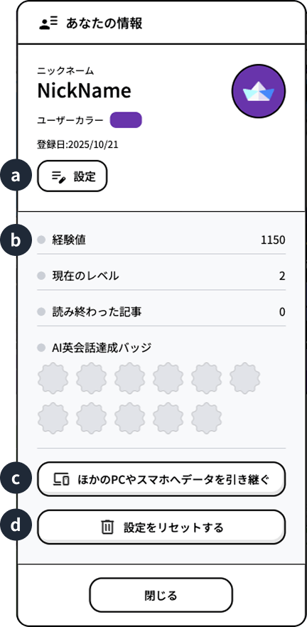 ニックネームやアイコン、テーマカラーの設定状況のほか、経験値や現在のレベル、読み終わった記事の数、AI英会話で獲得したバッジなど、あなたの情報をまとめて確認できる画面です。