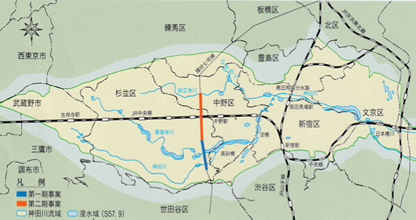 神田川・環状七号線地下調節池は、水害が多発した神田川中流域の水害に対する安全度を早期に向上させるため、環状七号線の道路下に造られた、神田川、善福寺川、妙正寺川の洪水を貯留する施設です。