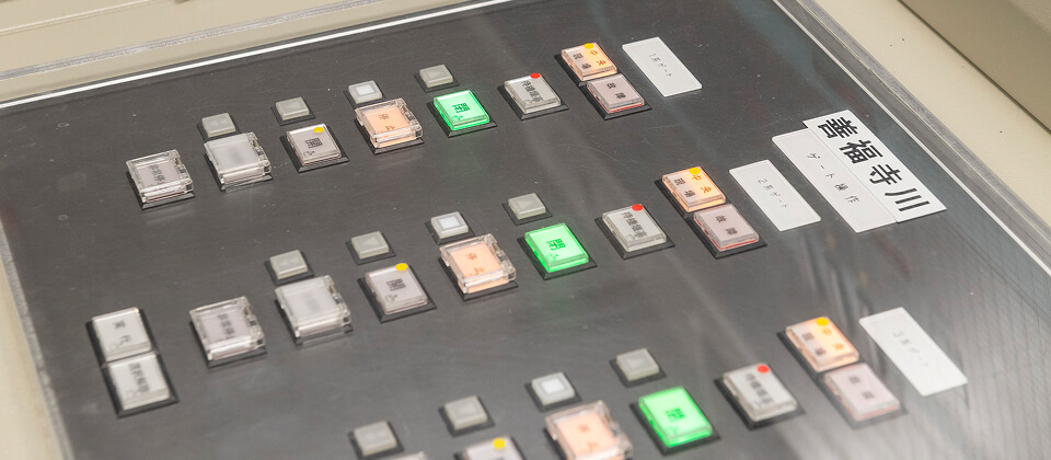 木村さん: 開ボタンを押してゲートを開けるんですが、誤って操作をしてしまうと大きな影響が出てしまうため、ヒューマンエラーを防ぐために必ず“二挙動操作”を行っています。開ボタンを1回押しただけではゲートは開きません。開ボタンを押すとボタンが点滅するので、もう1人の職員が正しい動作であることを確認した上で、実行ボタンを押します。これで初めてゲートが開くんです。あと、普段はボタンの表面にアクリルパネルをかぶせておいて、何か資料を置いてしまったり、職員が誤ってボタンに触ったりしてしまわないようにしています。妙正寺川、善福寺川、神田川のすべての取水、排水をここで管理しています。