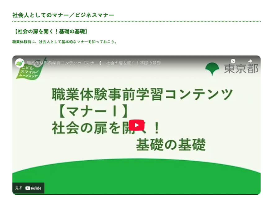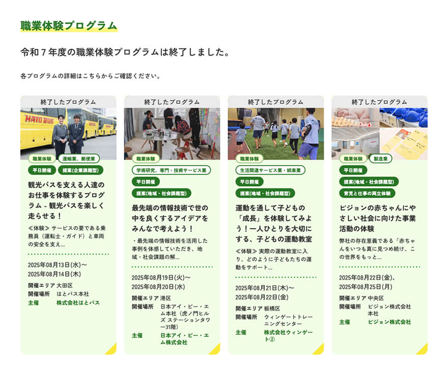 東京都の中高生が職業体験をやってみるためのWebサイト。中高生 政策決定参画プロジェクトにより、中高生の意見をもとに2025年7月にスタートした。サイト内には、職業体験プログラム、事前学習コンテンツ、レポート&フィードバックの3つがあり、職業体験の応募から事前学習、体験後のレポート記事までが網羅されている。