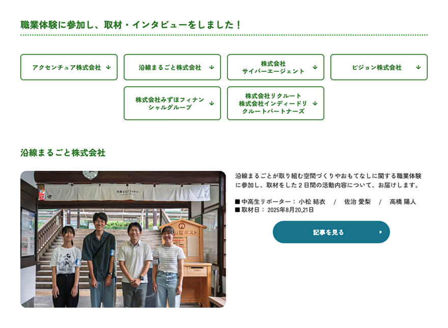 古瀬さん: Mr. Furuse: 昨年は職業体験に参加した中高生のうち、18人に中高生リポーターになってもらいました。3人1組になって記事を制作し、6社のレポートが掲載されています。リポーターは体験した職業体験について、日程ごとにやったことを報告し、経営層の方等へインタビューもしていただきます。実は取材メンバーのほだかくんは、みずほフィナンシャルグループに職業体験に行き、中高生リポーターもやってもらいました。Job EXには2日間の職業体験の様子と常務執行役員へのインタビューが掲載されています。中高生リポーターは体験するだけでなく、記事にして広くその様子を伝えていただきます。