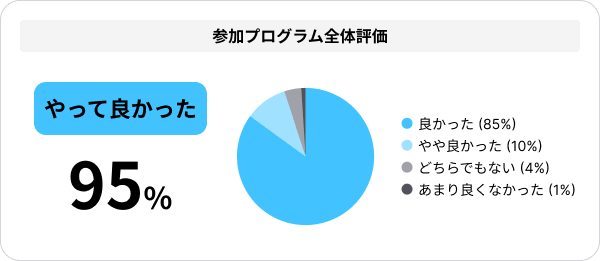 古瀬さん: Mr. Furuse: 参加した中高生にアンケートをとったところ、「やって良かった」という回答が95%、「体験した仕事への関心が高まった」との回答が90%を超えていて、全体として満足度は高かったようです。話を聞いてみると「働くことは楽しいと感じた」「企業の人からフィードバックをもらうことで、企業での考え方がわかった」という感想がありました。また、「働くことで自分がどんな分野に興味や関心があるかわかった」と将来の選択の参考になったという声もありました。