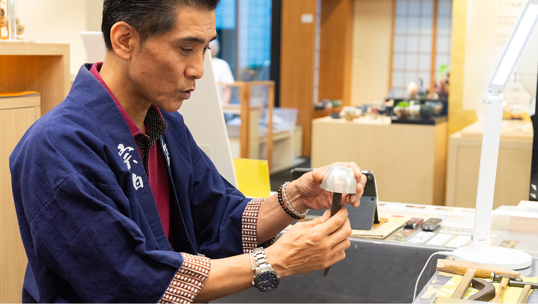 当時は江戸幕府から命じられて鎧兜(よろいかぶと)やお茶道具を作っていました。銀は打ち伸ばすと分子構造が変わって丈夫で長持ちする性質があり、それを現代に受け継いでいるのが銀師です。私自身は、この仕事を始めて32年になります。