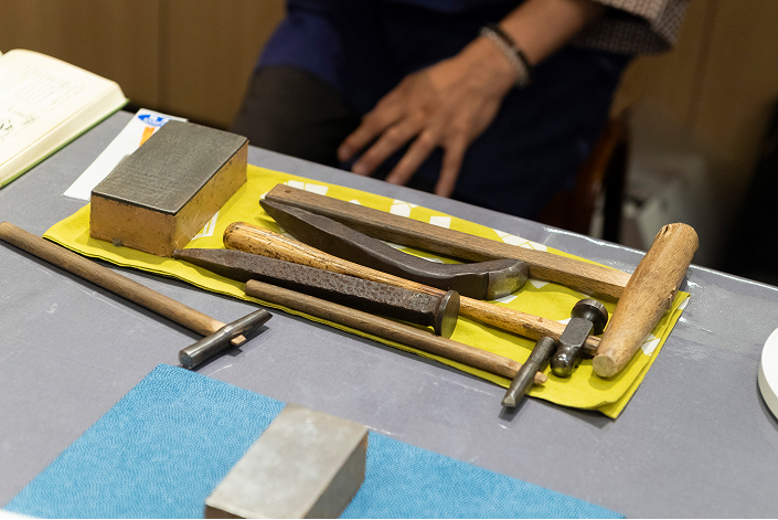 上川さん: 東京都の伝統工芸品42品目のうちの1つ「東京銀器」を作っています。私はそのなかでも銀師(しろがねし)という名前の職人です。江戸の元禄時代に職業を分類した文献があり、そこで鍛金(たんきん)加工をしていたのが私たちの親方に当たります。鍛金加工とは、金属を鍛える手法で金銀を打ち伸ばす仕事です。
