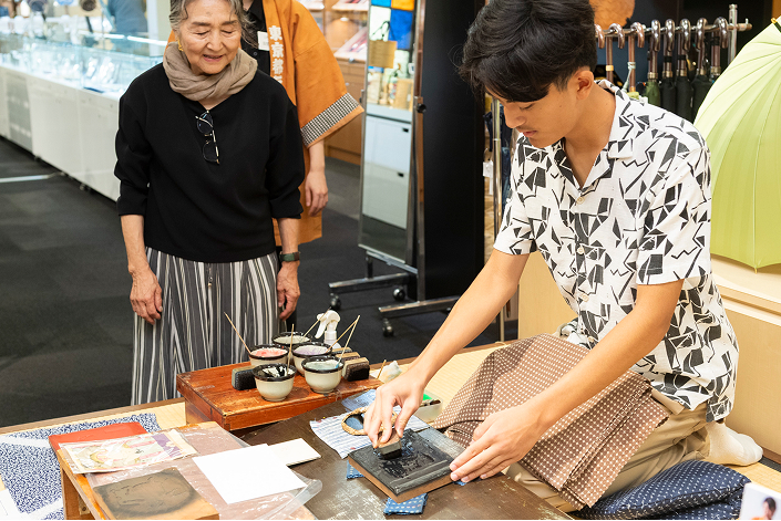 高橋さん: 私は江戸木版画の組合の理事もやっていて、若手の職人を集めて歌舞伎やお茶席に連れて行き、他の工芸や文化、美術も体験しましょうと伝えています。伝統工芸の職人になるなら、伝統文化そのものを勉強するのは常識です。なぜお茶席に連れていくかというと、お茶席のなかは全部工芸品だからです。私たちが身につける着物も扇子もそうですし、掛け軸もお釜もお茶碗も。なにか1つでも気付いてくれたらと思っています。版画の技術はやっていれば身に付きますが、それ以前のことを勉強してもらいたいと思っています。