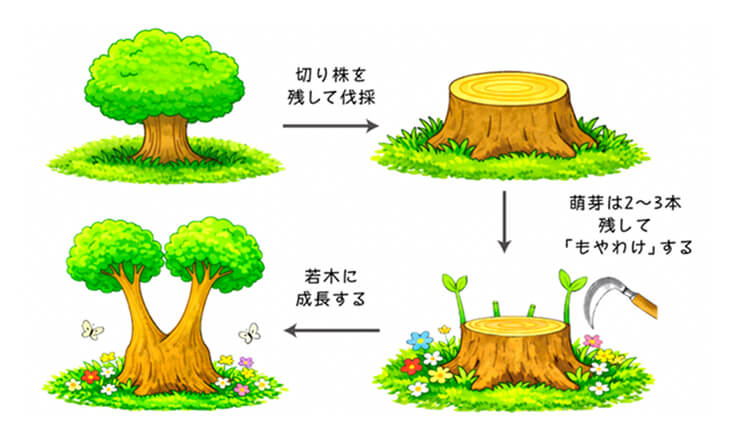 樹齢を重ねた木を伐採し、森を若返らせる方法を指します。木は切り株を残して伐採することで、新しい芽(萌芽)を伸ばします。数本伸びる萌芽の中から成長が見込めそうな2〜3本を選んで、残りを刈り取ることを「もやわけ」といいます。残した芽が成長すると若木となっていきます。