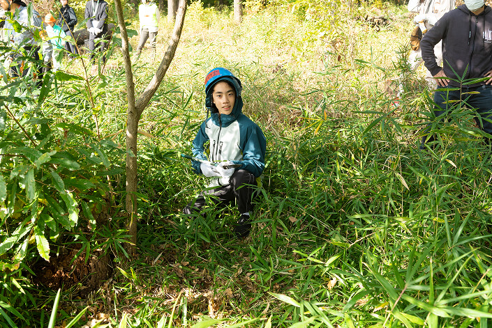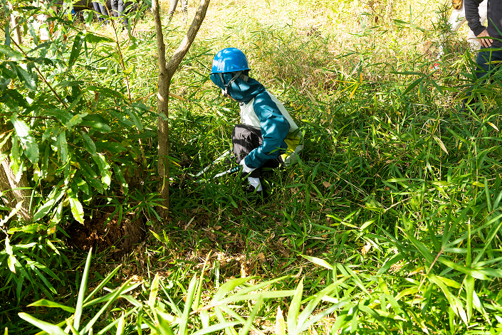 保全活動の1つめは、「下草刈り」。若い木の周りに生い茂った草を刈り取り、森を健全に保つための作業です。取材メンバーは保全地域活動団体の皆さんの指導を受け、地面に対して平行に刈込バサミを当てるコツなどを教わりました。もくもくと作業を続けると、たくさんの下草が刈れて、若木のまわりがすっきりときれいになりました。