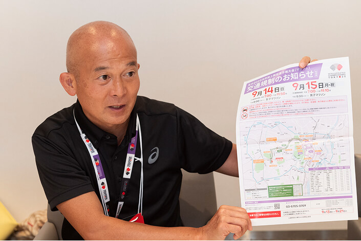 柴田さん: マラソンと競歩を担当し、主な仕事はコース設計です。マラソンコースはパリ五輪の代表選考会のコースをベースにする中で、全体の距離を短くして交通規制エリアを少なくしたり、世界陸連や放送局の要望を受けて東京駅前の馬車道を通したりして工夫を重ねました。最終的にコースの検定をして、警視庁や道路管理者、コース沿道区の合意を取り、競技の運営までやるのが仕事です。東京オリンピック2020のマラソンは東京でできなかったので、今回がとても楽しみです。沿道の応援の方にも地域住民の方にも各国のチームにも喜んでいただける大会にしたいですね!