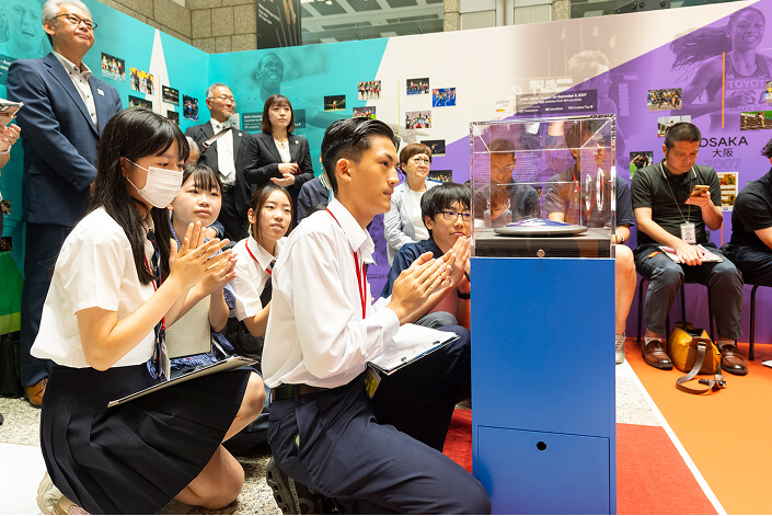 今回の展示のテーマは「TOKYO1991-2025」。セレモニーでは2つの大会の金・銀・銅メダルが一般公開されることが発表されました。さらに1991年大会の男子マラソンのアーカイブ映像も流され、谷口浩美さんが金メダルを獲得した様子を一同で見守ることに。2025年東京大会の期待感を高めるセレモニーとなっていました。