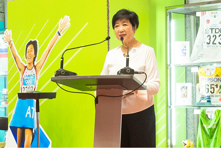 取材に訪れたのは、MOWAのオープニングセレモニー。会場である都庁第一本庁舎2階北側展示スペースで報道発表会が行われました。セレモニーには、東京都を代表して小池百合子都知事が出席し、1991年東京大会にも出場した有森裕子さん、2004年オリンピック女子マラソン金メダリストの野口みずきさん、1991年東京大会の男子マラソンで金メダルを獲得した谷口浩美さん、今回男子マラソンに出場する小山直城選手、東京2025世界陸上財団の尾縣貢会長が来賓として招かれていました。