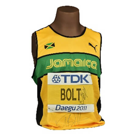 クリス: ウサイン・ボルトから2011年世界陸上韓国・大邱大会のときに寄贈されたユニフォームです。大邱大会で彼を案内したこともありますし、一緒にフィルムを作っていたので。でも全体としてどれが重要かといえば、偉大な選手ジェシー・オーエンスのユニフォームでしょう。彼は1935年の大会で45分の間に走り幅跳びなどで3つの世界記録を達成しました。それだけでなく、ベルリンオリンピックの4種目で金メダルを獲得しています。それらは都庁の45階に展示されています。