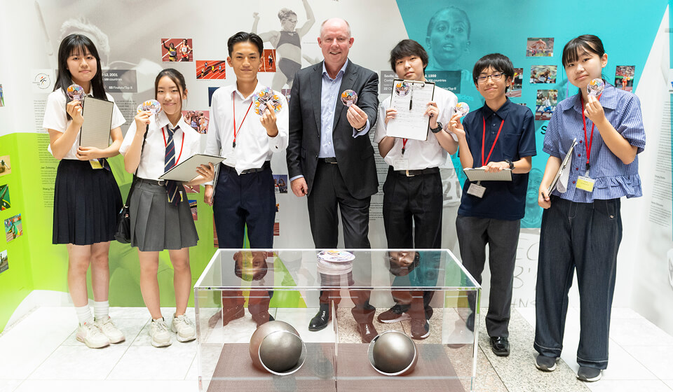2階の展示会場では金メダルや砲丸の展示、棒高跳や走高跳の世界記録がわかる展示やアスリートから寄贈されたユニフォームなどがあり、実際に見て触れて体感できる展示がありました。