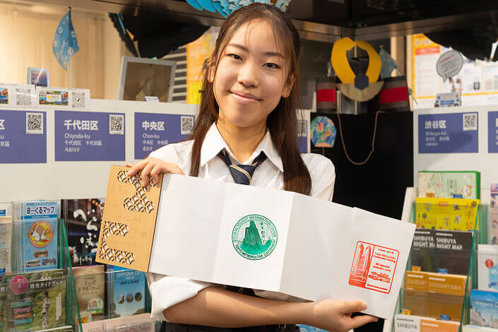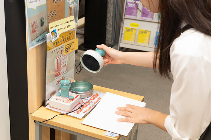 遠藤さん: Ms. Endo: 今、特に外国人の方に人気なのが、スタンプです。ここでも東京都のスタンプと東京観光情報センターオリジナルのスタンプを用意しています。スタンプのデザインは5カ所ある支所ごとに全部違います。皆さんスタンプ帳のようなノートをご自身で持っていらして、スタンプを目当てにいらっしゃる方も。ここに行列ができていることもあります。このスタンプはスタンプ台のいらないインク内蔵式のスタンプです。1つ困ってしまうのは、外国人の方はこのタイプをご存じない方が多くて、ものすごく力を入れて押される方が多いんです。それでたまに壊れてしまうこともあって…(笑)。